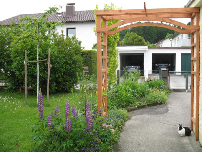Als Sichtschutz sind hinten im Beet noch Sträucher gepflanzt worden, die jetzt noch sehr klein sind, ausgewachsen aber nicht höher als 1,50 m werden.
